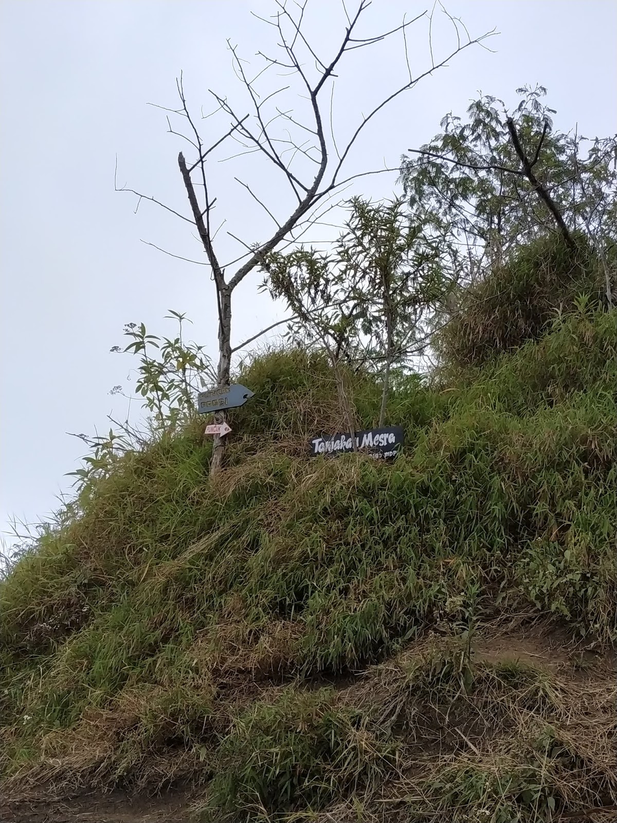 Pos IV Sabana – Pos V Tanjakan Mesra, setelah putus asa saya membangkitkan kembali semangat untuk melanjutkan menuju pos tanjakan mesra, jalur ini sudah keluar hutan, kanan dan kiri jalur pendakian banyak tumbuhan edelweiss jalurnya seperti namanya mesra sekali sahabat. Berhubung tidak musim hujan jalur ini banyak debu. Kenapa mesra? Untuk sampai ke pos tanjakan mesra kita harus saling bantu- membatu supaya kita tidak jatuh dan tergelincir, baik naik atu pun turun di pos ini kita harus saling berpegangan tangan atau cari pegangan akar yang kuat. Perjalanan menuju tanjakan mesra dari pos sabana kurang lebih 15 menit.